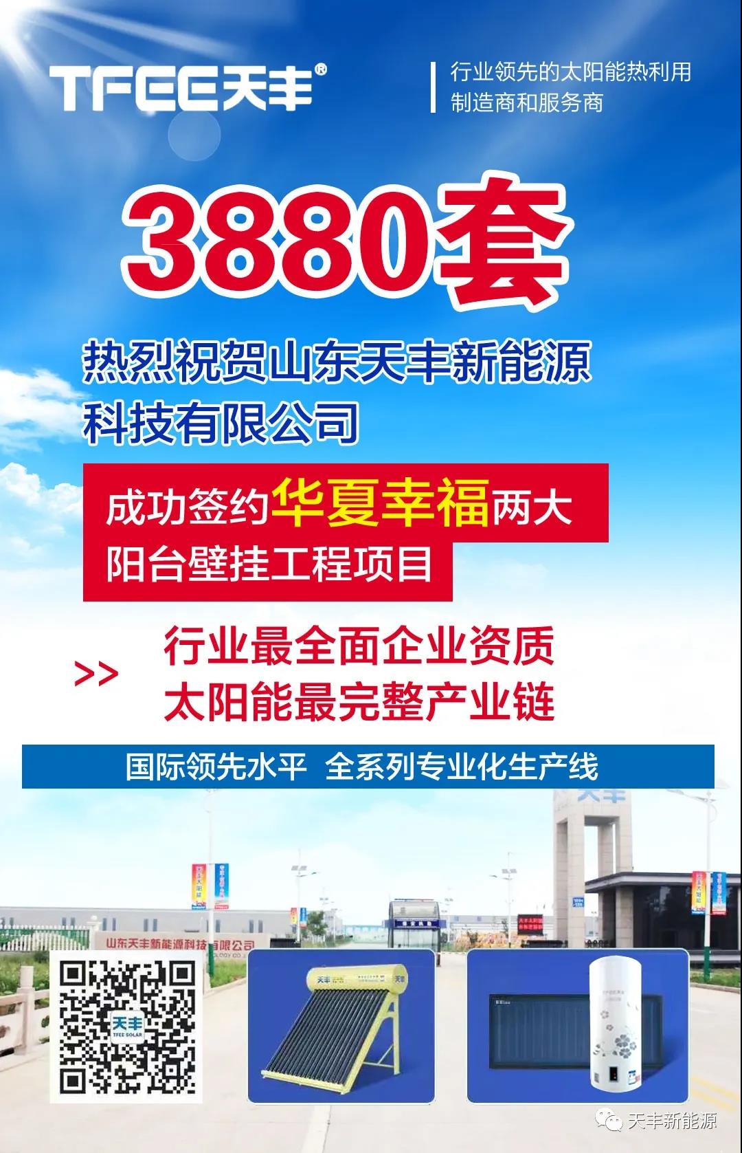 2021年,天豐繼續延續良好的發展勢頭,在房地產陽臺壁掛市場領域喜訊不斷,一路凱歌,近日,公司工程部再添雙單,成功與華夏幸福地產簽約,后續將全程操作華夏幸福兩大陽臺壁掛工程項目,陽臺壁掛太陽能熱水器數量方面,第一項工程1882套,第二項工程1998套,共計3880套,在牛年春節到來之際,雙喜臨門,再創佳績。